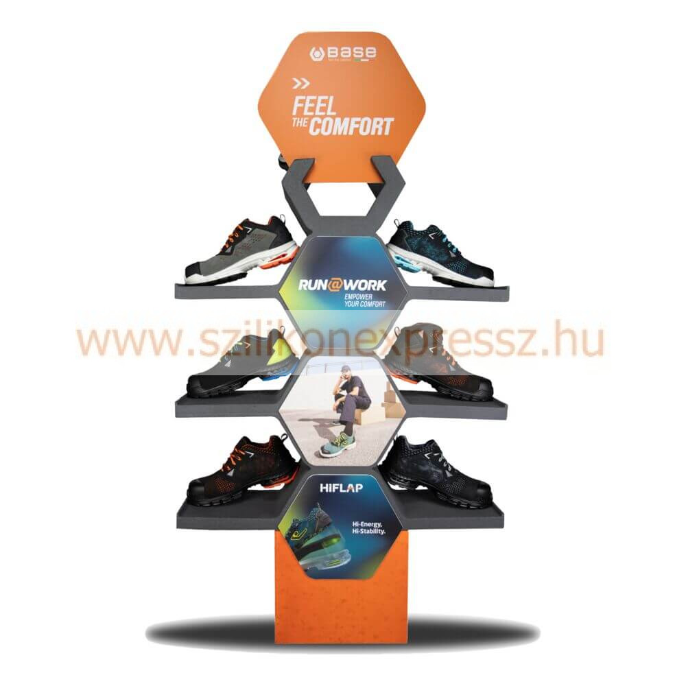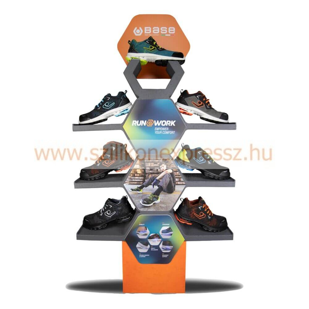 Base lábbelik kiemelésére tervezett állvány, amely minimális alapterületen maximális termék láthatóságot biztosít.