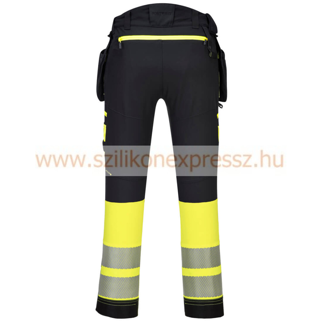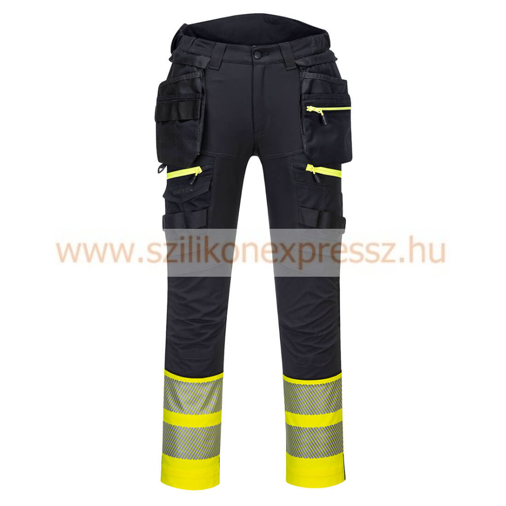 A DX4 lengőzsebes nadrág okosan megtervezett, a dinamikus 4X stretch anyag célzott elhelyezésével biztosítja a maximális mozgástartományt munka közben. Ezek a lengőzsebes nadrágok magasan emelkedő hátsó derékpánttal rendelkeznek, oldalt elasztikusak, ezzel biztosítva a védelmet minden pozícióban. Előre hajlított, felülről tölthető, állítható térdvédő zsebek, nagyméretű elülső zsebek és többfunkciós cipzáras combzsebek biztonságos tárolást kínálnak. Háromszoros varrás a maximális tartósság érdekében. 4 irányban nyúló anyag a nagyobb mozgásszabadság és a kényelem érdekében, Könnyű, rugalmas HiVisTex Pro szegmentált fényvisszaverő szalag a jobb láthatóság érdekében, 16 sokoldalú, praktikus tárolózsebbel, Colstok tartó zseb, Háromszoros varrások az extra tartósságért, Sokoldalú lecipzározható lengőzsebek, 40+ UPF minősítésű alapanyag, amely az UV-sugarak 98%-át blokkolja., EN ISO 20471 szabvány szerint 25 mosásra minősítve, Új modell, Slim fit design a kivételes komfortért, Felső nyílású térdzsebek a gyors és könnyű hozzáférésért, Oldalt gumírozott derék az egyedülálló kényelemért, CE minősítés, *Regisztrált európai közösségi design, Megfelel az EN ISO 20471 szabványnak, Azonosítókártya tartó az igazolványok megjelenítéséhez, Hőillesztett, szegmentált fényvisszaverő szalag hozzáadott jól láthatóságért, Rejtett telefontartó zseb, Egy pár díjmentes térdpárna a DX4 derekas nadrághoz