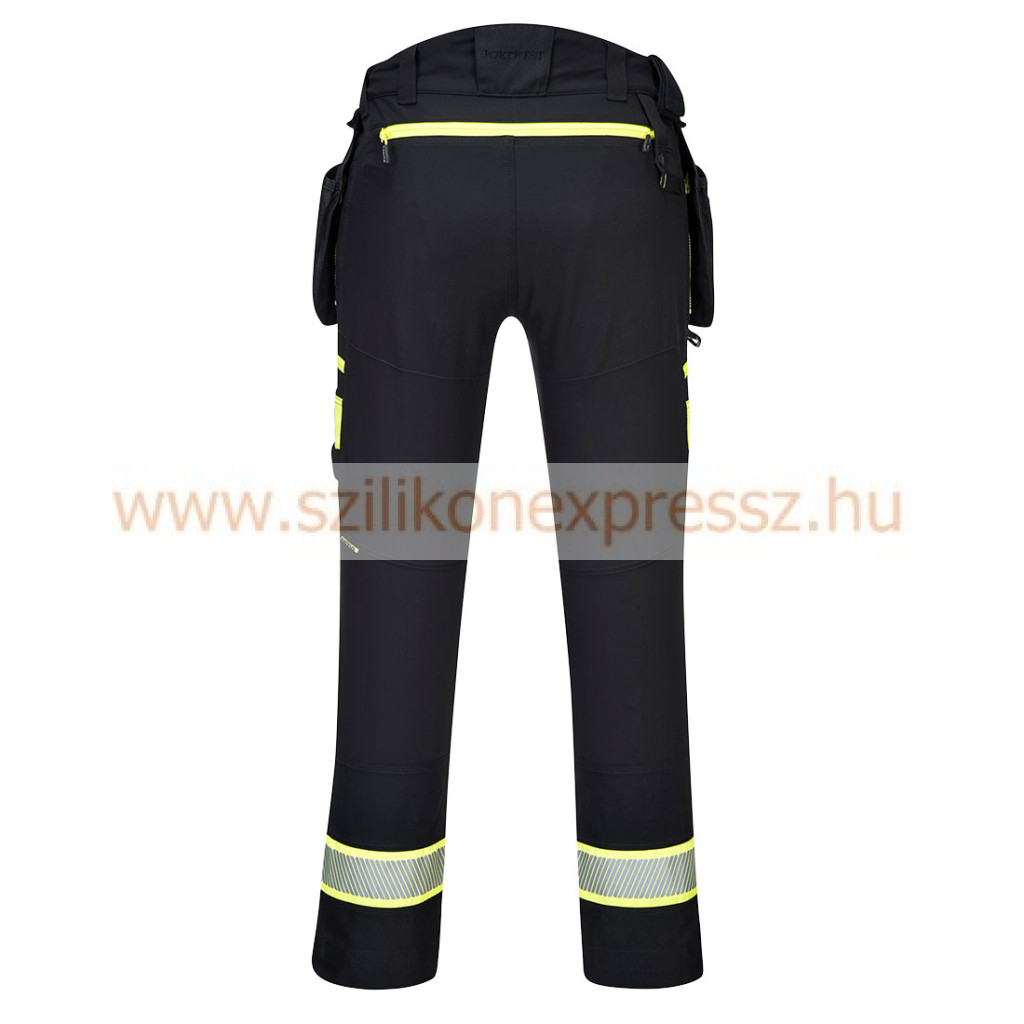 A DX4 lengőzsebes Portwest nadrág ergonómikus kialakítású mely dinamikus 4X stretch panelekkel biztosítja a maximális mozgásszabadságot. A nadrág emelt derék- és elasztikus oldalrésszel rendelkezik melyek kiváló komfortot biztosítanak minden munkapozícióban. Felülről behelyezhető térdpárna tartó zseb nagyméretű elülső és többfunkciós cipzáras zsebek biztosítják a telefon tollak és szerszámok biztonságos tárolását. A háromszoros varrások maximális tartósságot biztosítanak. UPF 50+ Új modell Vonalzótartó zseb Háromszoros varrás Kalapács hurok Egyedi innovatív zsebkialakítás Okostelefon tartó Többféle cipzáros rekesz Fényvisszaverő csíkozás Oldalt gumírozott derék Felső nyílású térdzsebek D gyűrű Többfunkciós tárolózsebek 16 zseb Hátsó cipzáras zseb Aktív illeszkedés Állítható szárhossz Minden fontos helyen megerősített Két rétegű térdvédő zsebek HiVisTex Pro fényvisszaverő szalag Megerősített panelek 4 utas rugalmas anyag Regisztrált európai közösségi design Modern ergonomikus kialakítás Magasított derék Ágyék erősítés cipzár húzó Portwest logóval