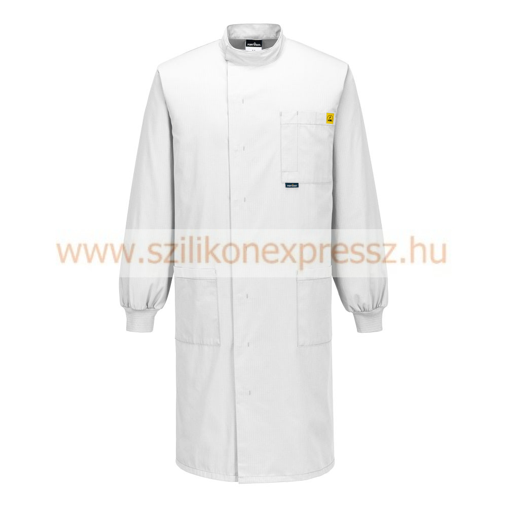 ESD környezetben történő használatra alkalmas kabát, amely az EN 61340-5-1 szabvány szerint tesztelt, gépben mosható (60°C), tartós poliészter/pamut szövettel, szövetbe szőtt szénszálakkal (ESD és antisztatikus tulajdonságokat biztosítanak), a könnyű nyitás érdekében hat sor patenttal, meleget és extra komfortot biztosító bordás mandzsettával, 3 sokoldalú, praktikus tárolózsebbel, tolltartó zsebbel, 2 combzsebbel és CE minősítéssel rendelkezik.
