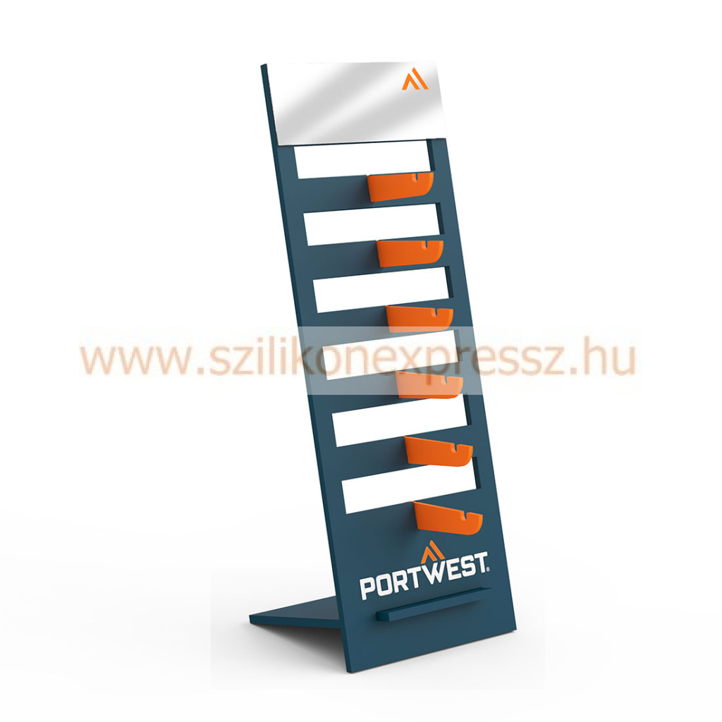 Portwest védőszemüveg állvány, amely stílusos megjelenésével és modern, többszintes elrendezésével mutatja be a szemüvegek széles választékát.