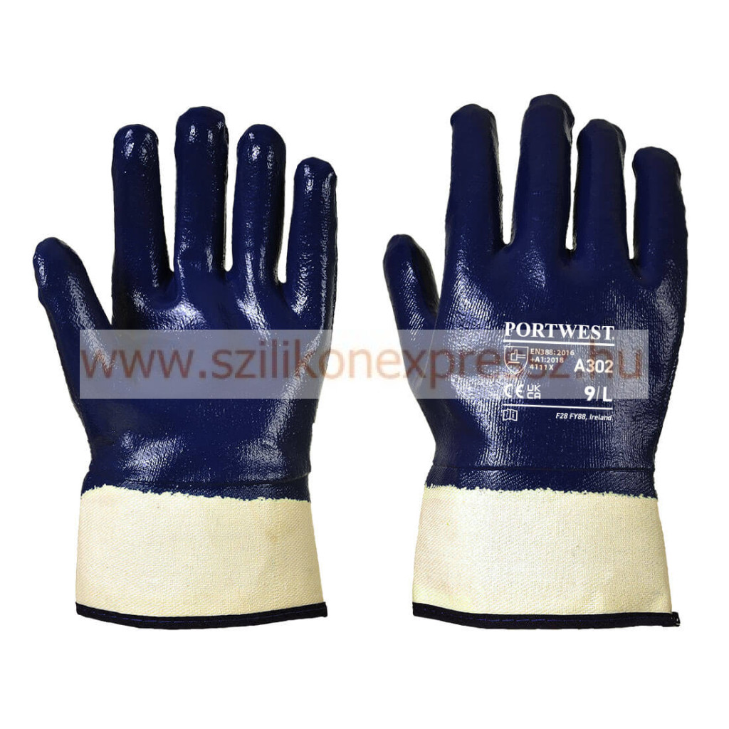 Rendkívül strapabíró munkavédelmi kesztyű, csuklóig mártott nitril bevonattal, amely ellenáll az éles tárgyaknak, vágásnak, szúrásnak és szakításnak. A vászon biztonsági mandzsetta a nagyobb védelmet garantálja. A népszerű A301 cikkszámú védőkesztyű modell csuklóig mártott változata. Maximális EN 4-es szintű kopásállóság. Eléri a pontos, 5. szintű kézügyességi szintet. CE minősítés.