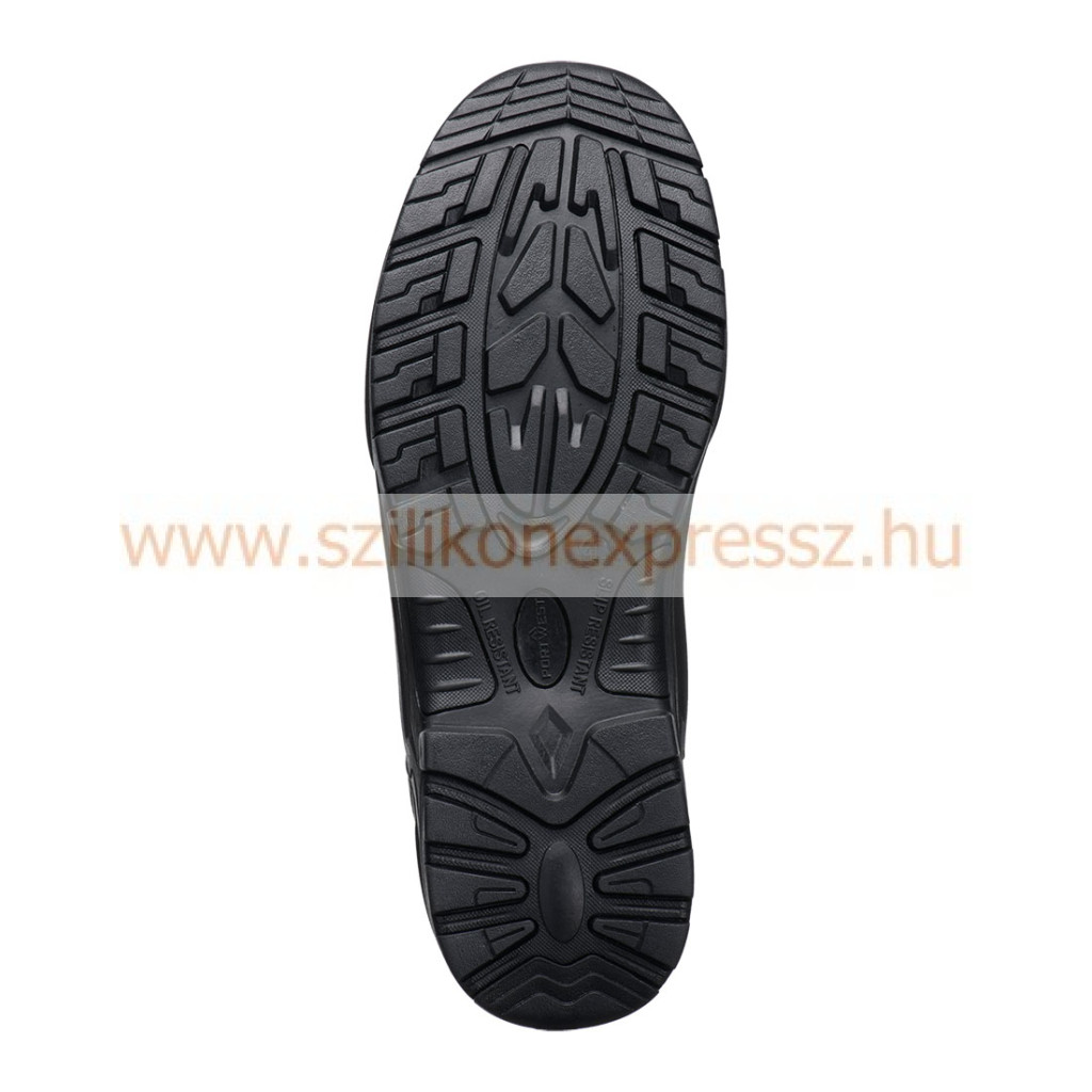 Védő acél lábfejjel, talpátszúrás elleni acél talplemezzel, hőálló külső talppal (300°C), strapabíró orrborítással, energiaelnyelő sarokkal, PU/gumi, csúszásmentes talppal és CE minősítéssel rendelkező antisztatikus munkavédelmi bakancs, amely olaj- és vízálló.